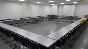 講義やセミナーに適した形式です。講師の説明に集中しやすく、大人数の収容に向いています。間隔を空けることで試験会場としてもご利用いただけます。